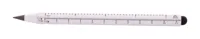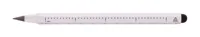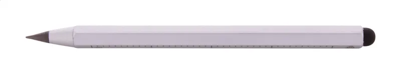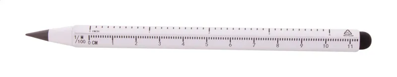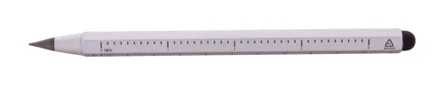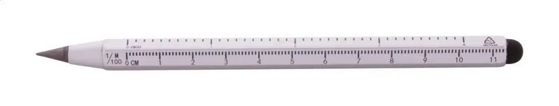 Újrahasznosított alumíniumból készült, hosszantartó tintamentes toll érintőképernyős gombbal és fémötvözet heggyel, amely oxidálja a papírt. Hatszögletű markolattal, 11 cm-es és 4 hüvelykes vonalzóval. Ez a toll egy ceruzához hasonlóan ír és radírozható.