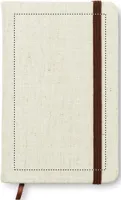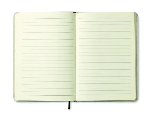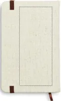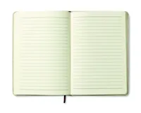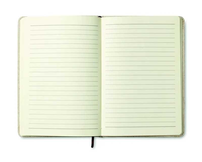 A6 jegyzetfüzet keménytáblás vászonborítóval. Cérnafűzött. 192 vonalas oldal (96 lap) újrahasznosított papírból. Kontrasztos elasztikus zárópánt és könyvjelző szalag.