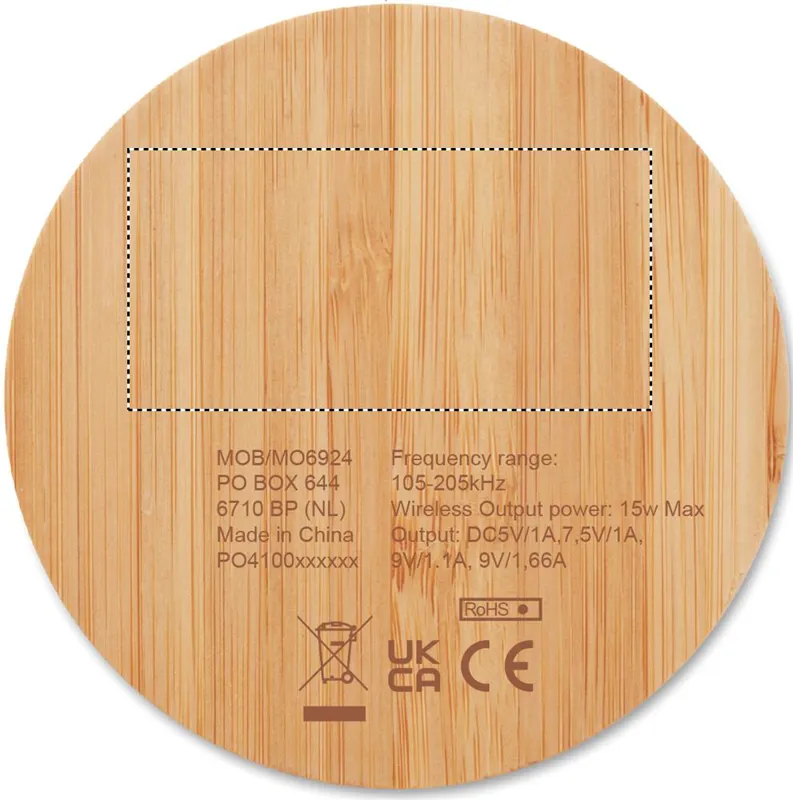 Vezeték nélküli gyorstöltő bambusz házban. Csatlakoztassa a készüléket számítógépéhez, és fektesse rá telefonját a töltéshez. Töltéskor kék fény világít. Teljesítmény: DC 9V/1,67A (15W). A bambusz természetes anyag, színében,