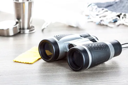 Műanyag távcső tisztító kendővel, nylon tokban, 4× nagyítással.