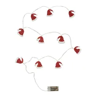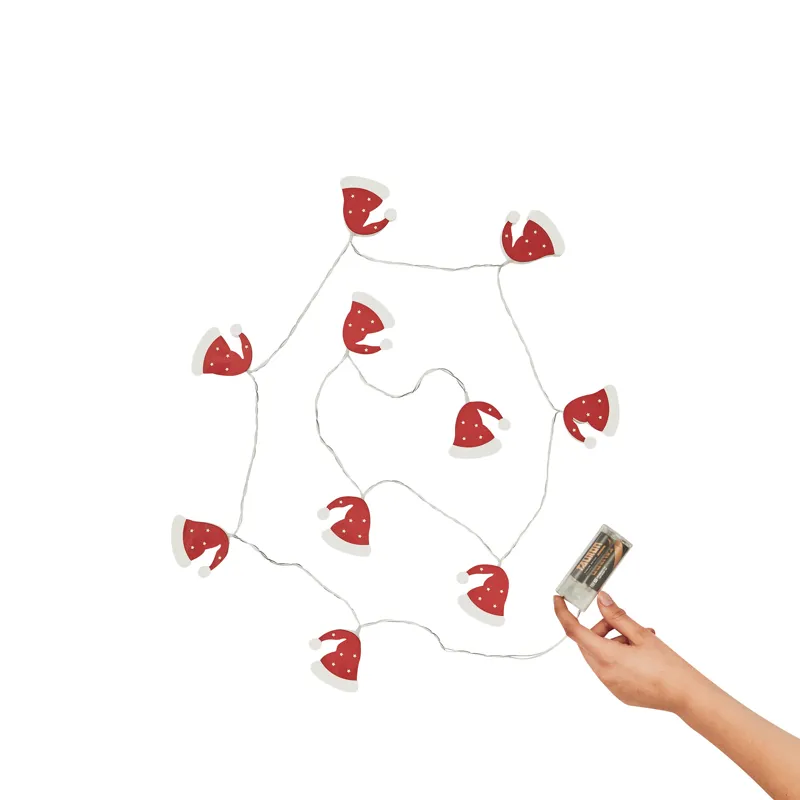 SANTA CAP karácsonyi égőfüzér: kb. 168 cm hosszú, mind a 10 fa Mikulás sapka meleg fehér LED-del világít, időzítő funkcióval (6 óra be, 18 óra kikapcsolva), elemmel működik (2x AA elem, nem tartozék)