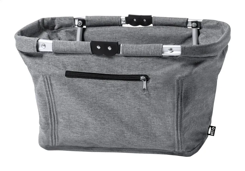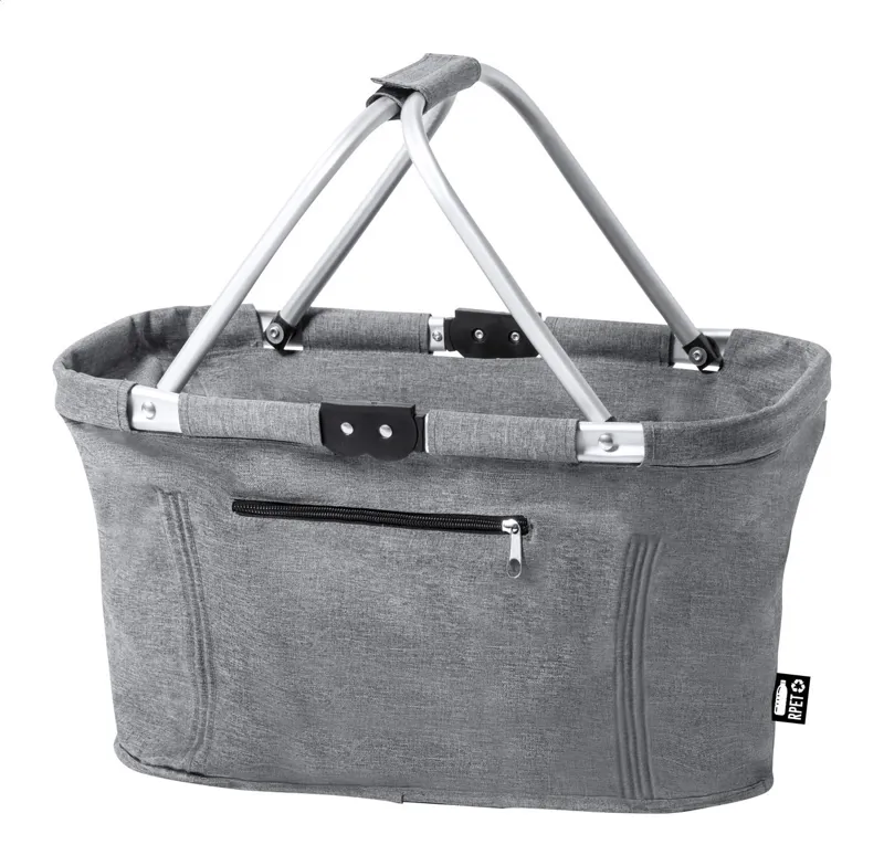 Összecsukható piknikkosár 600D RPET poliészterből, alumínium kerettel és cipzáras elülső zsebbel. Megkülönböztető RPET címkével.