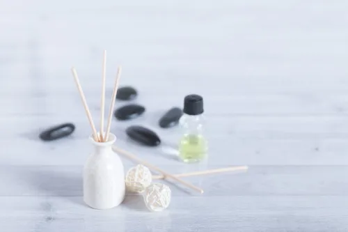 Aroma szett, tartalmaz 1 db kis méretű kerámia vázát, 5 db pálcát, 2 db dísz gömböt és jázmin illatú illóolajat. Fehér papírdobozban szállítjuk.