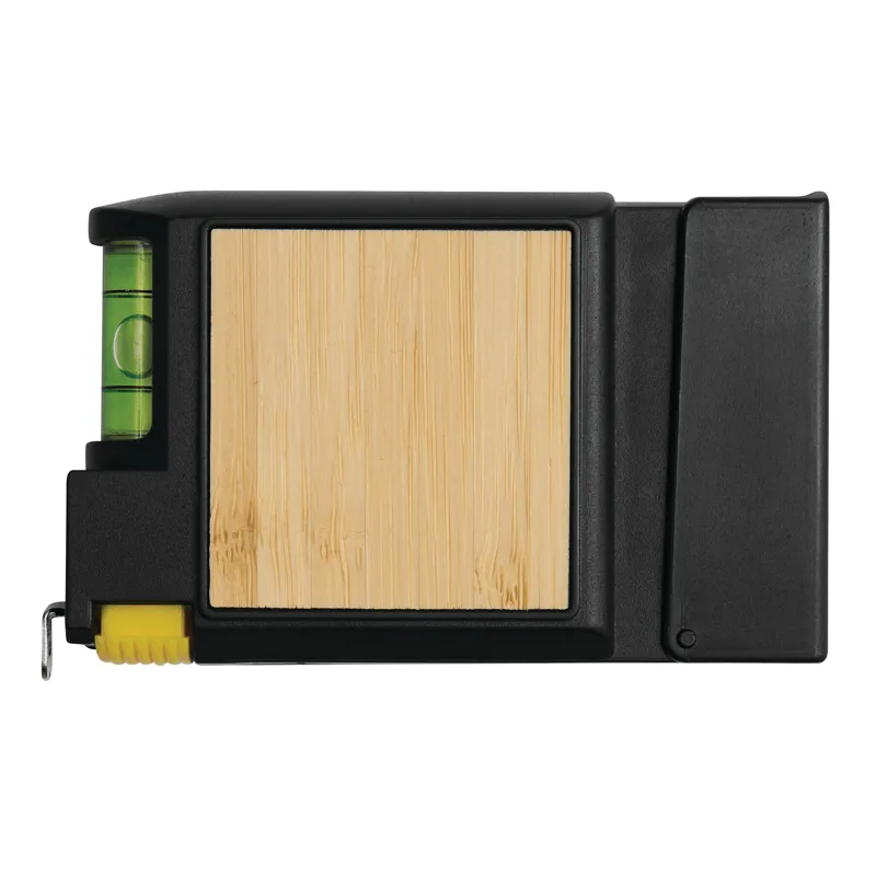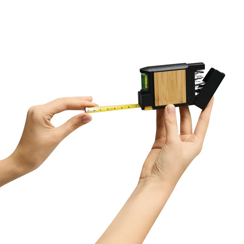 SCREWY mérőszalag: visszahúzható, vízmértékkel, csavarhúzó 5 különböző fúrófejjel, és bambuszlap a logó számára, 3 m-es
