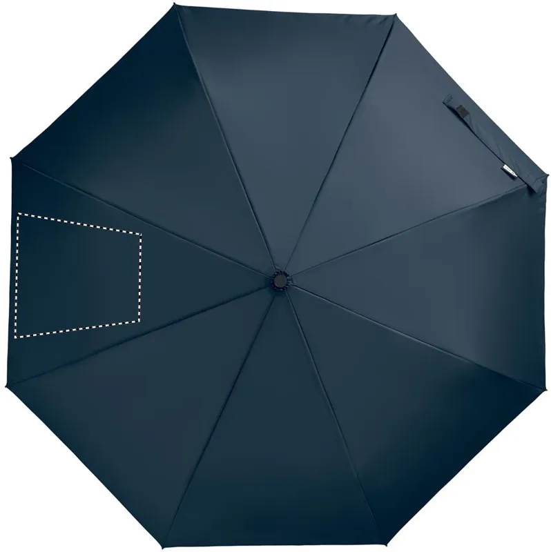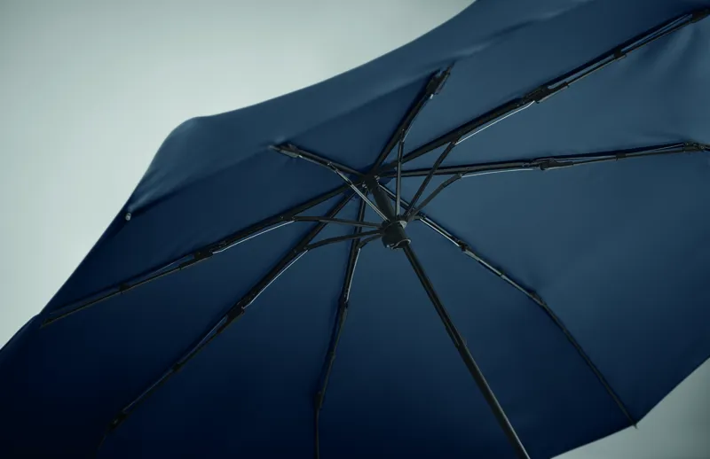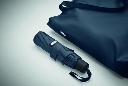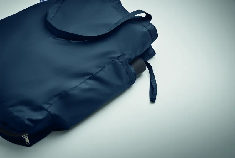 21 colos, egyharmad részre csukható, manuális nyitású és záródású, szélálló esernyő 190T RPET nyersselyem pongee anyagból, bevásárlótáska tokkal. A táska rejtett cipzáras rekesszel rendelkezik, amely az esernyő tárolására szolgál és szárazon tartja a táska tartalmát. Amikor a táska nincs használatban, feltekerhető, és a cipzáras rekesz az esernyő tokjaként működik.