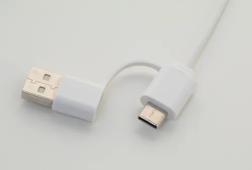 Félig átlátszó, bambusz USB hub látható elektronikus alkatrészekkel, 2 USB és 2 USB-C porttal, USB 2.0. USB és USB-C csatlakozós kábellel.