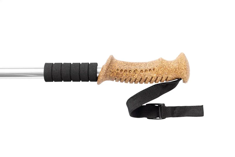 Kihúzható sétabot alumínium vázzal, természetes parafa anyagú ergonomikus fogóval, csuklópánttal és anti-shock rendszerrel. Hókosárral a hordtáskában.