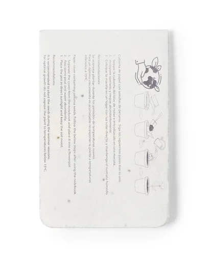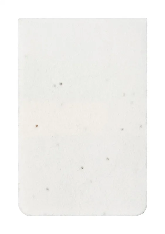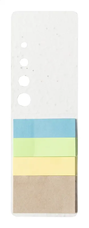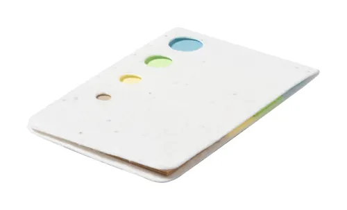 Újrahasznosított papírból készült öntapadós jegyzettömb magpapír borítóval, 10 lappal és 30 oldaljelölővel (3 különböző színben). A magpapír borító különböző vadvirág magokat tartalmaz, melyeket a borító és a füzet szétválasztása után lehet elültetni.