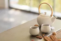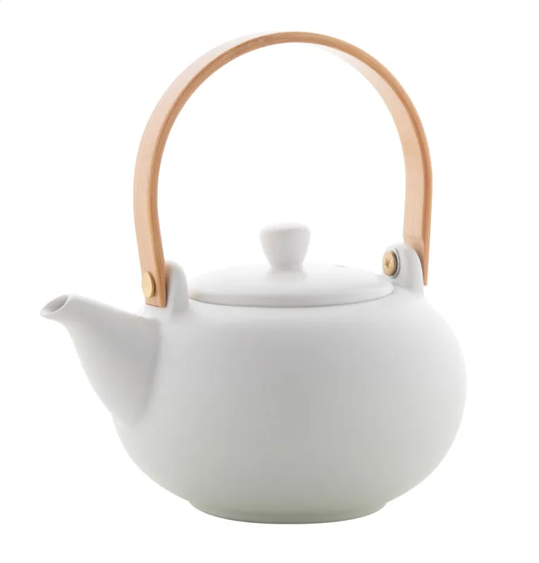Kerámia teakészlet. Egy teáskannát bambusz fogantyúval (600 ml) és két csészét (110 ml) tartalmaz. Kraft papír dobozban szállítjuk.