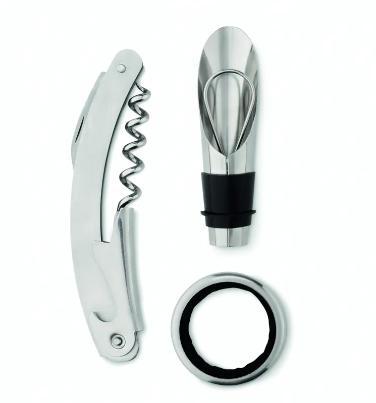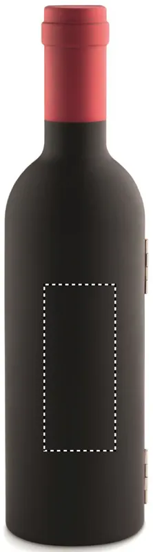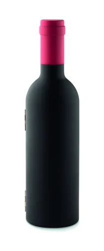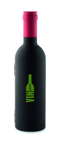 Boros szett borosüveg alakú dobozban. Palack visszazárót, dugóhúzót és cseppfogó gyűrűt tartalmaz. A doboz mágnessel záródik.