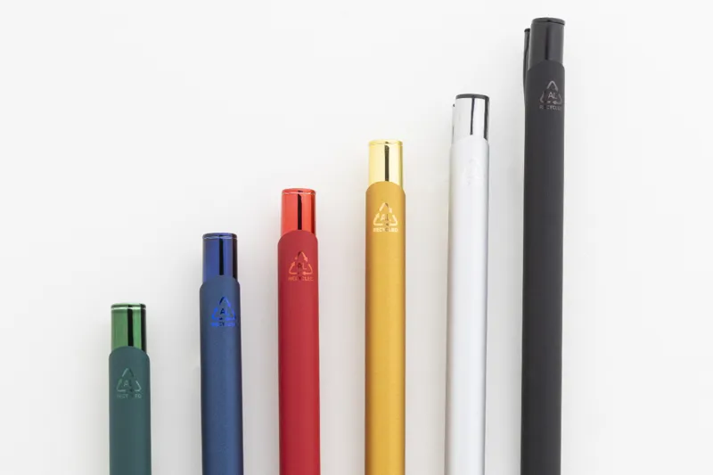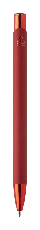 Újrahasznosított alumínium golyóstoll gumírozott testtel és színes, fényes, metálfényű részekkel. Speciális bevonattal a fém alkatrészekhez illő tükörgravírozáshoz. Kék tollbetéttel.