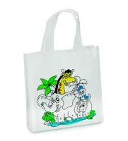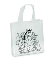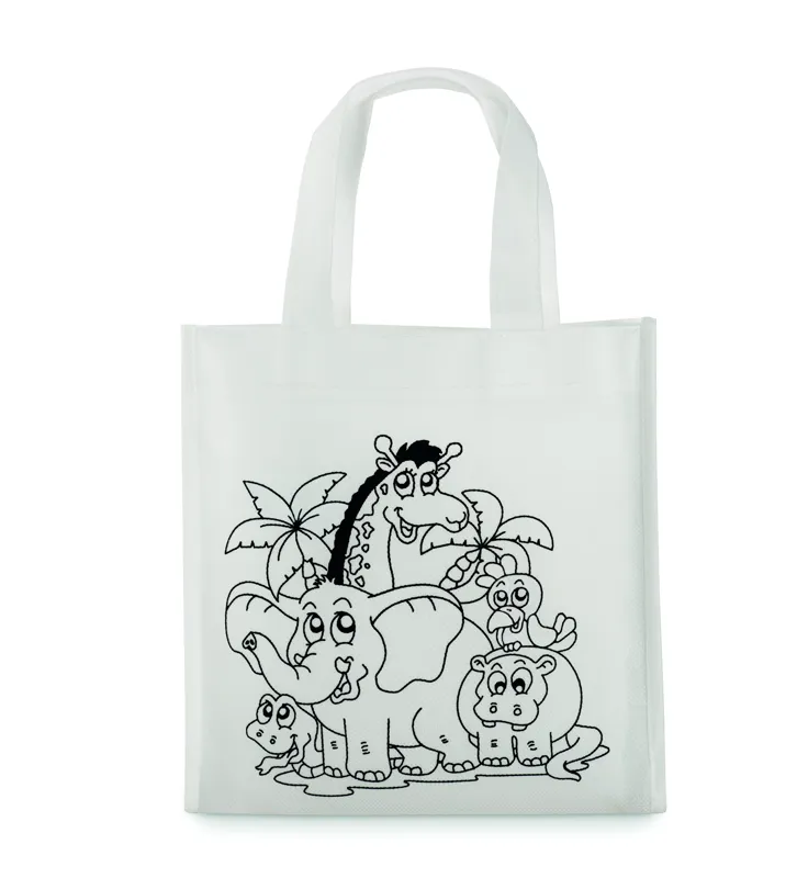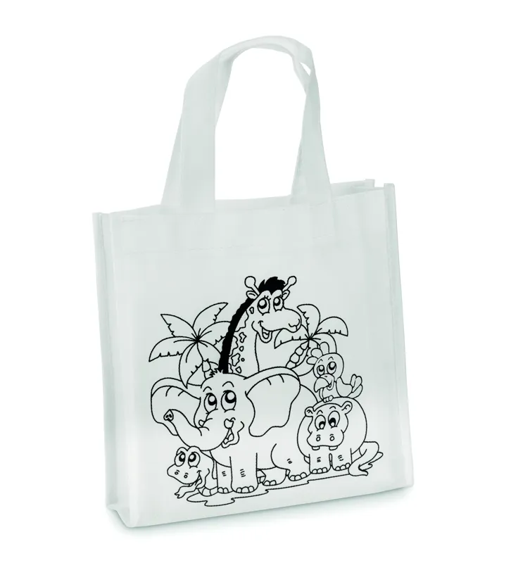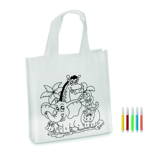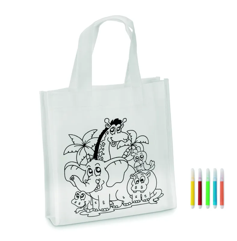 Nemszőtt anyagú mini bevásárlótáska. 5 színező filccel. 80 g vastag anyag.