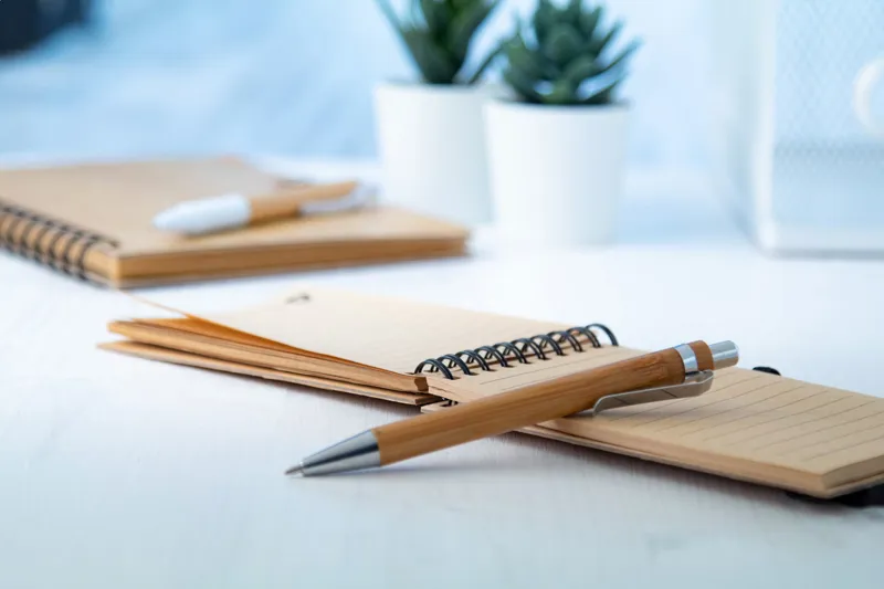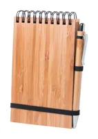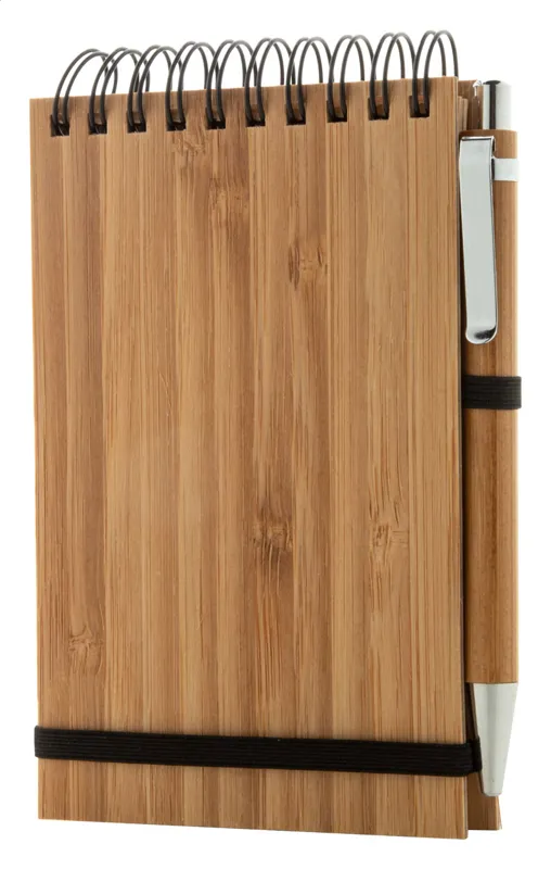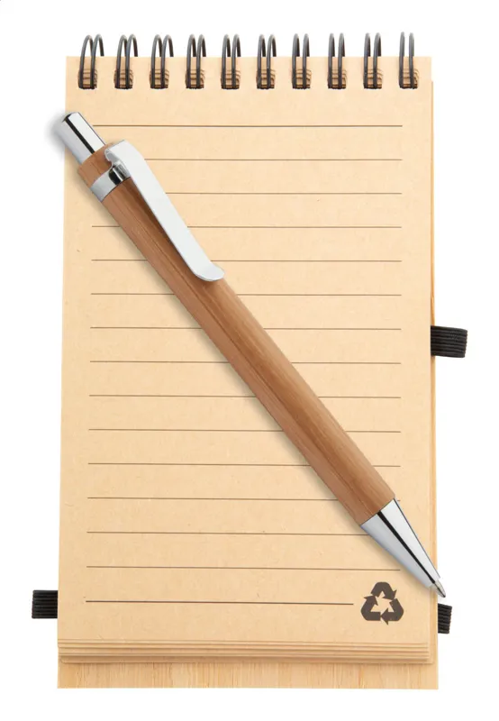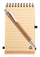 Bambuszból készült spirál jegyzetfüzet 70 vonalas lappal. Bambuszból készült golyóstollal, kék tollbetéttel szállítjuk.