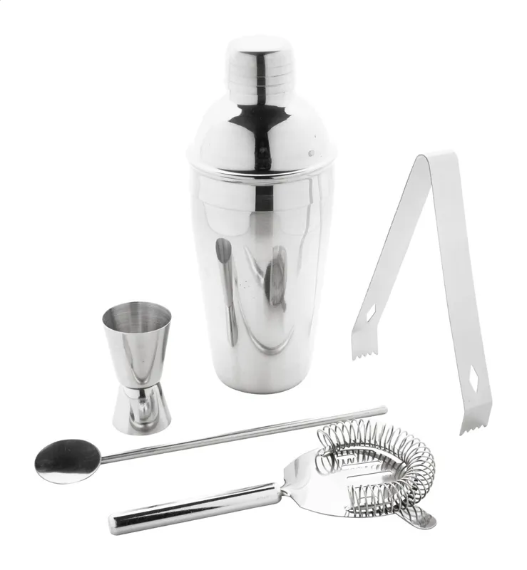 5 db-os rozsdamentes acél koktél szett kraft papír dobozban. Tartalma: koktél shaker (550 ml), mérőpohár, szűrő, bárkanál és jégfogó.