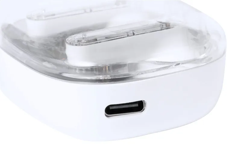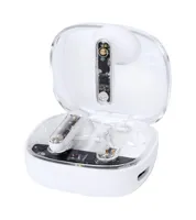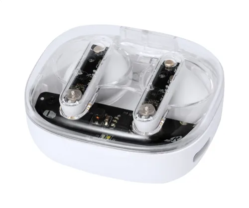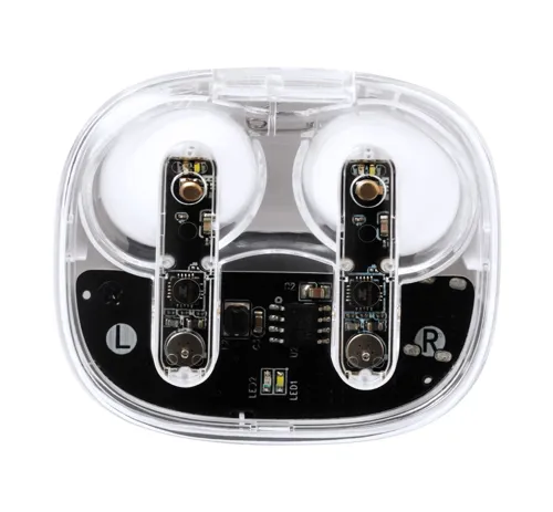 Félig átlátszó, valódi vezeték nélküli (TWS) fülhallgató látható elektronikus alkatrészekkel és kihangosító funkcióval. Félig átlátszó műanyag töltőtokban. USB töltőkábellel szállítjuk.