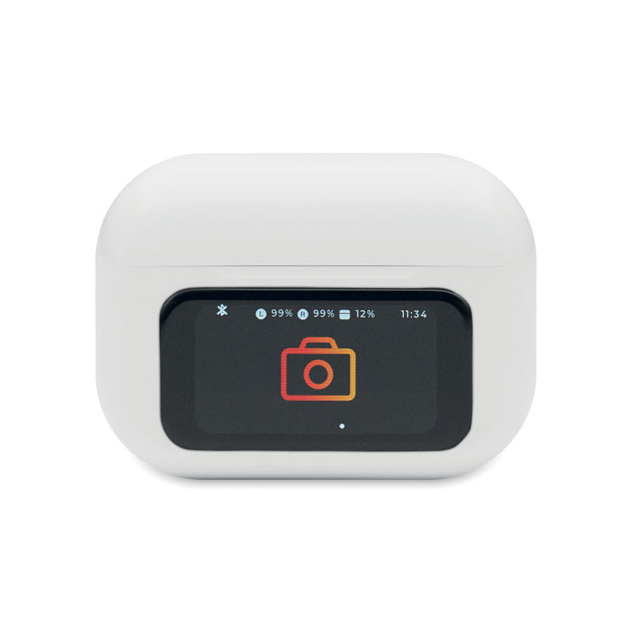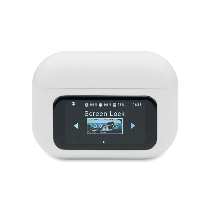 TWS (True Wireless Stereo) 5.0 vezeték nélküli sztereó fülhallgató újrahasznosított ABS-ből, ANC/ENC zajszűréssel, mikrofonnal, 30 mAh beépített újratölthető akkumulátorral és 230 mAh töltődobozzal. Érintőképernyős kijelző.
