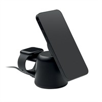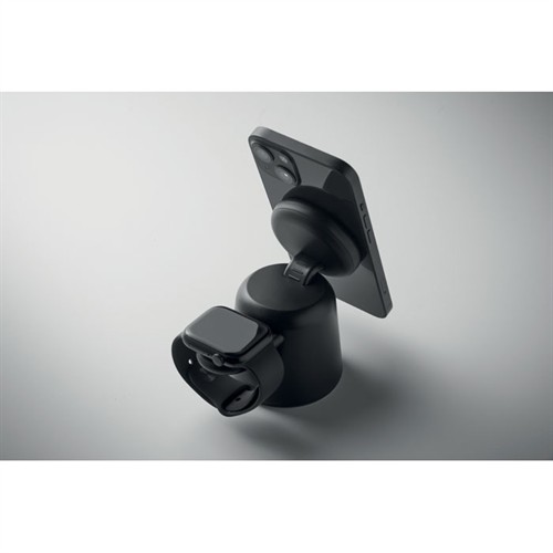 3 az 1-ben töltőállomás ABS-ből. 15 W-os mágneses vezeték nélküli töltő telefonhoz és TWS-hez, telefontartó funkcióval, valamint okosóra töltő (csak iOS). iPhone® 12 és újabb készülékekkel kompatibilis. További fémgyűrűt tartalmaz a nem mágneses telefonok támogatásához.