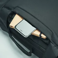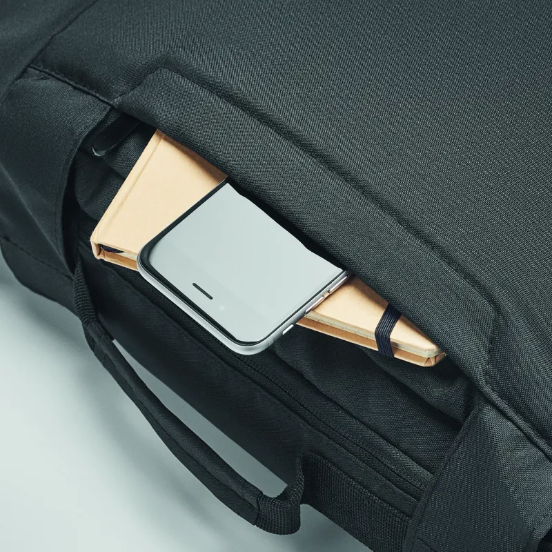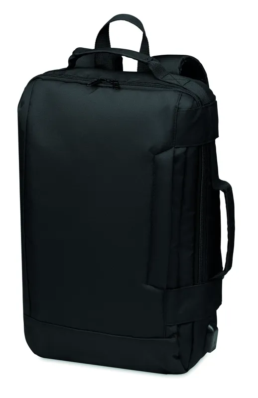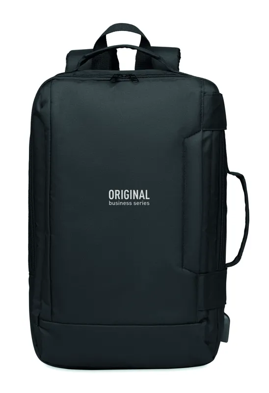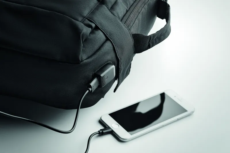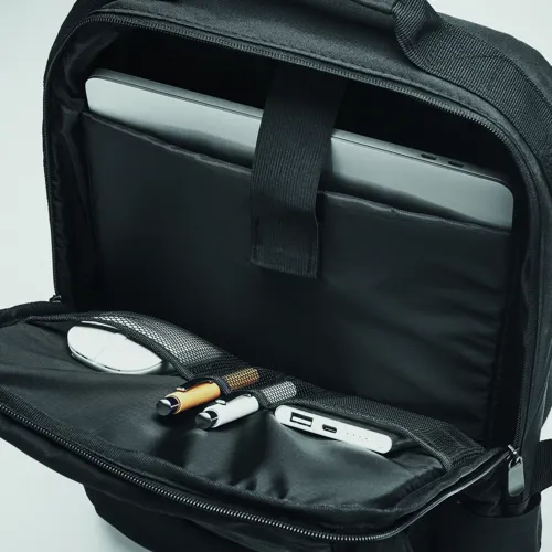 Laptop hátitáska 300D RPET poliészterből, párnázott vállpánttal. A táska 16 colos laptop számára alkalmas fő belső rekesszel, valamint USB töltőkábellel rendelkezik.