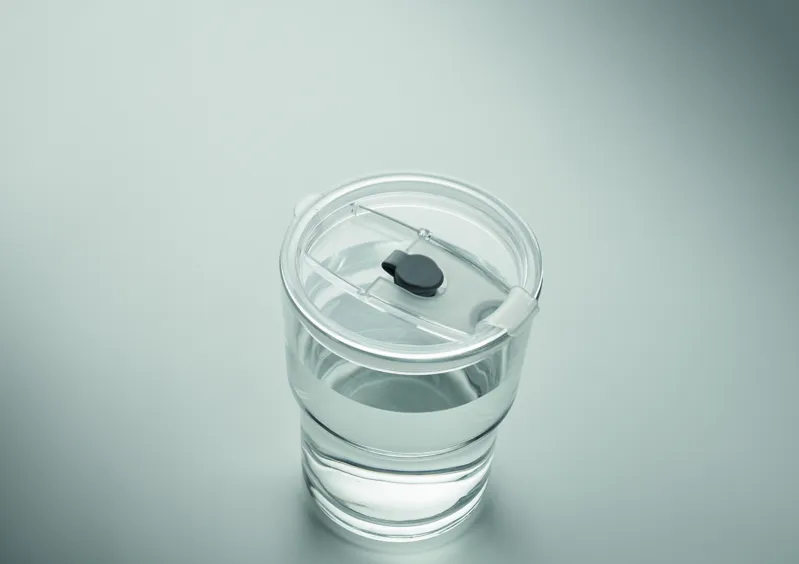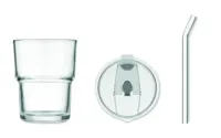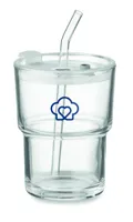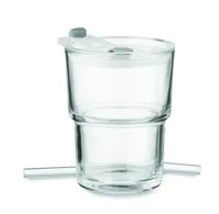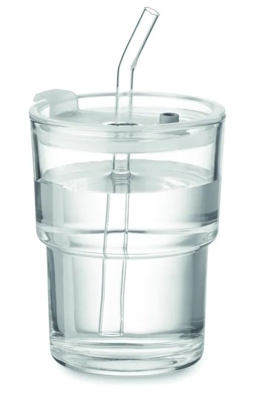 Üveg pohár fedővel, kivehető üveg szívószállal. Szivárgásmentes fedél szívószállal és nyitható ivónyílással. Űrtartalom: 300 ml.