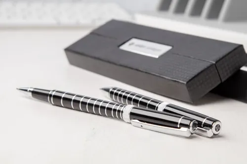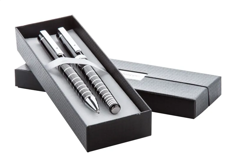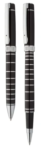 Elegáns, alumínium toll szett, mely rollertollat és golyóstollat tartalmaz. Fényes testtel és króm gyűrűkkel. Fekete díszdobozban, kék tollbetéttel szállítjuk. André Philippe márkatermék.