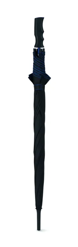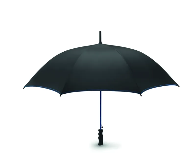 23 colos automata viharesernyő 190T nyersselyem anyagból. Üvegszálas nyél és váz, fekete műanyag csúcsok. Fekete panelek színben hozzáillő varrással. Fekete egyenes, műanyag markolat. Manuális záródás.
