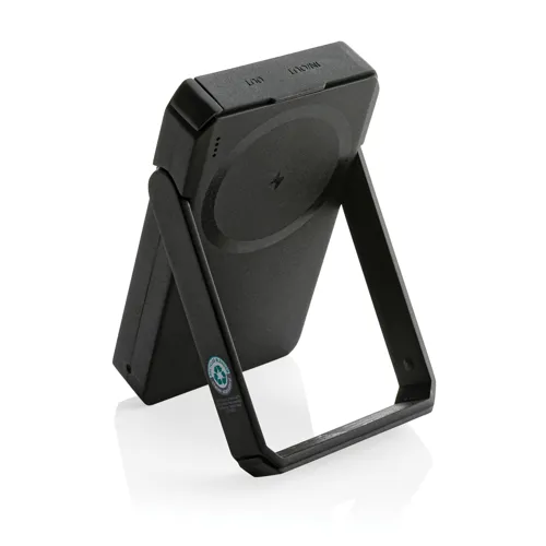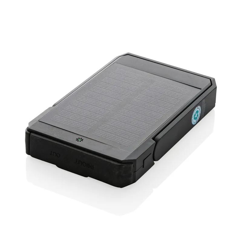5000 mAh napelemes powerbank RCS újrahasznosított ABS-ből. Teljes újrahasznosított anyag tartalom: 21% a termék összsúlya alapján. Az RCS-tanúsítvány biztosítja az újrahasznosított anyagok ellátási láncát. A powerbank 19%-os konverziós aránnyal használ kiváló minőségű monokristályos napelemeket. A töltési arány a feltételektől függ. Beépített állvány funkcióval a napelemek optimális szögben történő használatához. Hosszú élettartamú, A-fokozatú, 5000 mAh-s lítium akkumulátorral. 10W-os, vezeték nélküli mágneses töltővel. Töltési sebesség napenergia: 5 V/130 mA. C típusú bemenete: 5 V/2 A. Kimenete: USB A: 5 V/2 A C típus: 5 V/2 A. A termék és tartozékai PVC-mentesek. RCS újrahasznosított TPE töltőkábellel. FSC® mix csomagolásban. Bejegyzett dizájn®