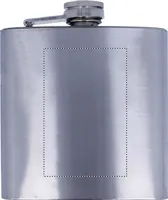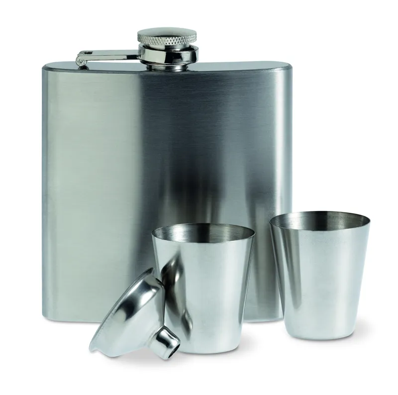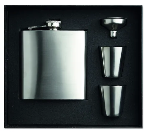 Selyemfényű szimplafalú laposüveg 2 pohárral. Űrtartalom: 175 ml. Fekete ajándékdobozban.