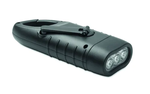 3 fehér LED-es, napelemmel és dinamóval is működő zseblámpa újrahasznosított ABS-ből, 40 mAh akkumulátorral.