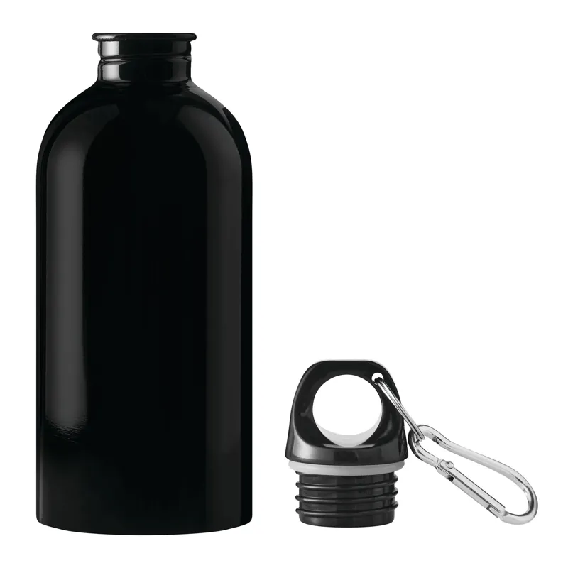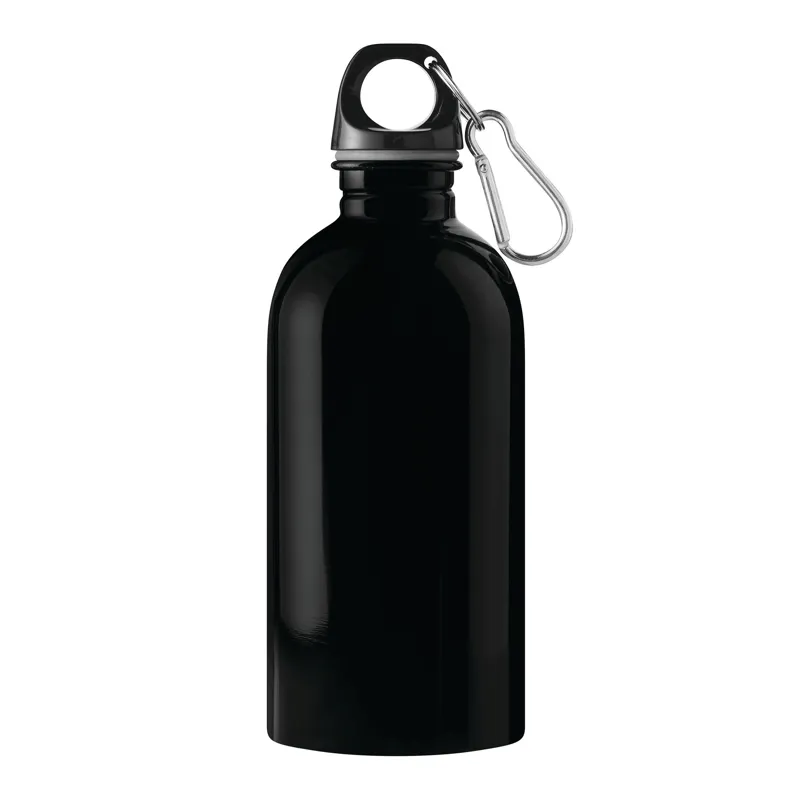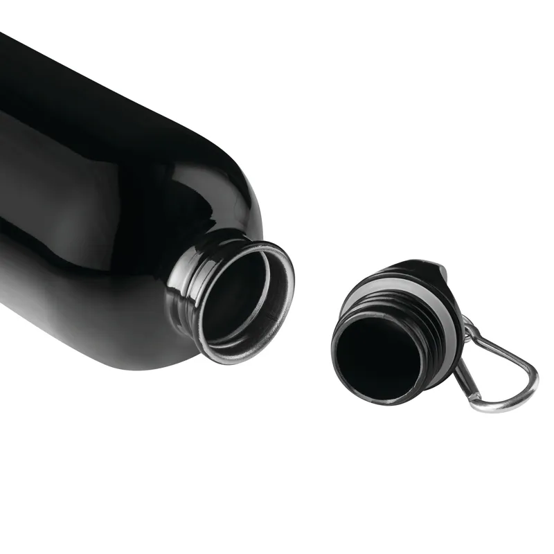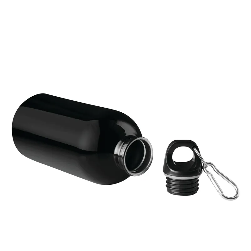 SMALLTRANSIT ivópalack, egyfalú: újrahasznosított rozsdamentes acélból készült, biztonságos fekete csavaros kupak műanyagból, szilikon tömítőgyűrű, hordozófogantyú, kulcstartó és karabiner (a karabiner NEM alkalmas mászásra), űrtartalom kb. 400 ml