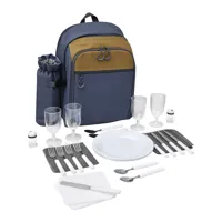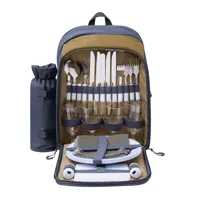SMART TRIP piknik hátizsák 4 személyes: szigetelt fő rekesz cipzárral, középső rekesz cipzárral, rozsdamentes acél evőeszköz műanyag fogóval, 4 műanyag pohár és tányér, 4 szalvéta, só- és borsszóró, elülső rekesz cipzárral, füllel, párnázott vállpántok, 1 levehető szigetelt kulacstartó az oldalán