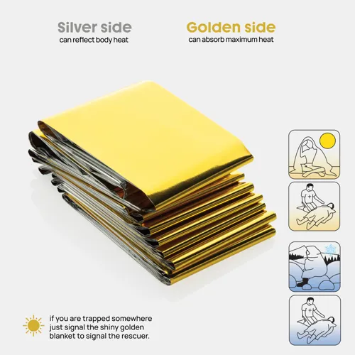 Megbízható védelmet nyújt kültéri vagy vészhelyzeti helyzetekben, könnyű és kompakt megoldást kínálva, amely egyszerre újrahasználható és vízálló. Tartós PET Mylar fóliából készült, az egyik oldala ezüst, a másik oldala arany, és 12 μm vastagságú az optimális hőmegőrzés és időjárásállóság érdekében. Az RCS újrahasznosított tasak RPET 420D poliészterből készült, és egy tépőzárral ellátott fedél segítségével biztonságosan nyitható és zárható, így a takaró biztonságosan és kompakt módon tárolható. Az EN ISO 15223-1:2021 szabványnak megfelelően a papír kézikönyv tartalmazza az összes információt, szimbólumot és kötelező jelölést, beleértve a lejárati dátumot, a CE jelölést, a gyártási tételszámot, a gyártói információkat és a meghatalmazott képviselő címét.RCS újrahasznosított anyagokból készült tasak. Az RCS-tanúsítvány biztosítja az újrahasznosított anyagok ellátási láncát. Teljes újrahasznosított anyagtartalom: 35% a termék összsúlya alapján. PVC-mentes.