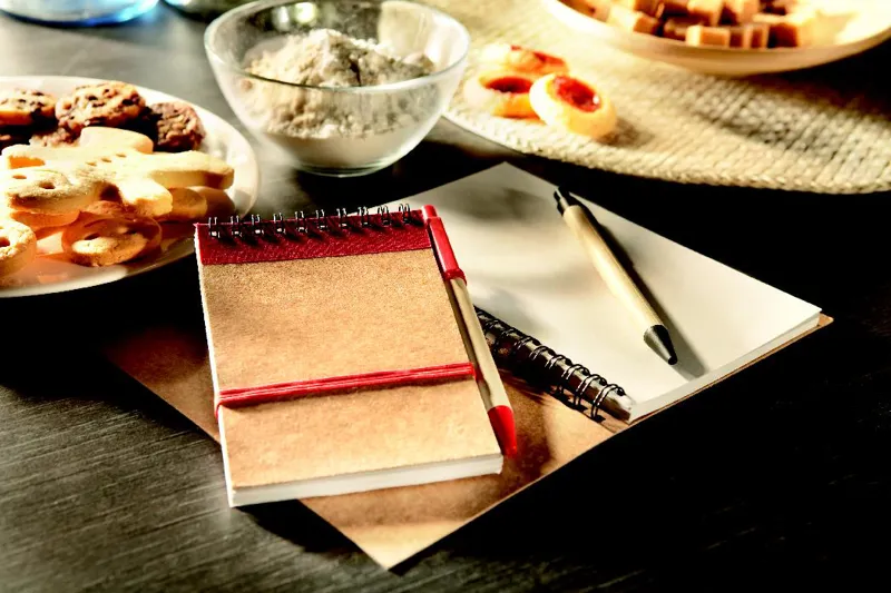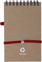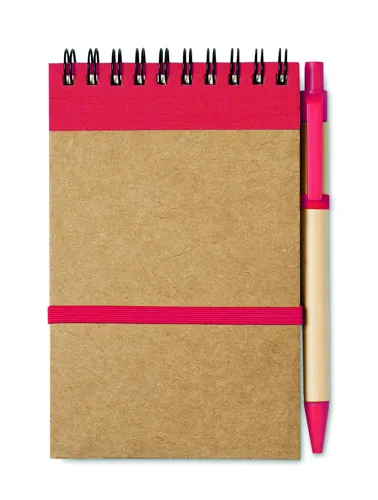 A6 újrahasznosított papírból készült jegyzetfüzet, hozzáillő tollal. Ikerspirálozott. 140 sima oldal (70 lap) újrahasznosított papírból. Illeszkedő színű elasztikus zárópánt és tolltartó hurok. Nyomógombos golyóstoll újrahasznosított karton tolltesttel, színben illeszkedő, biológiailag lebomló műanyag szerelvényekkel. Kéken író betéttel. FSC®-certified | FSC MIX, P7.1, FSC-C213206