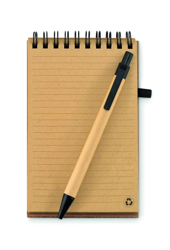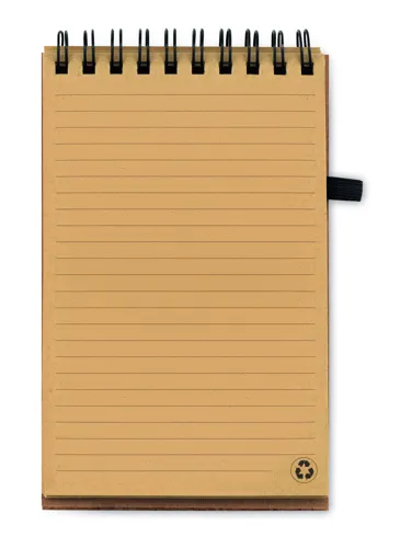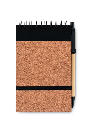 A6 jegyzettömb parafa borítóval. Ikerspirálozott. 70 vonalas lap újrahasznosított papírból. Hozzáillő nyomógombos golyóstoll, újrahasznosított kartonból készült tolltesttel és kukorica PLA szerelvényekkel. Feketén író betéttel. Elasztikus zárópánt és tolltartó hurok. A parafa 100%-ban természetes anyag. Szerkezeti jellege és felületi porozitása miatt az egyes tárgyak végső emblémázási eredménye eltéréseket mutathat.
