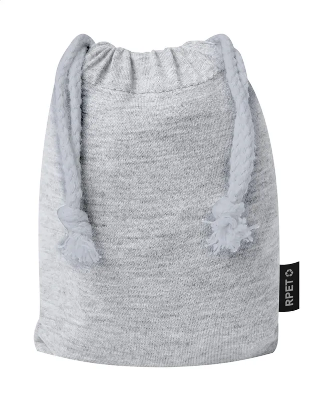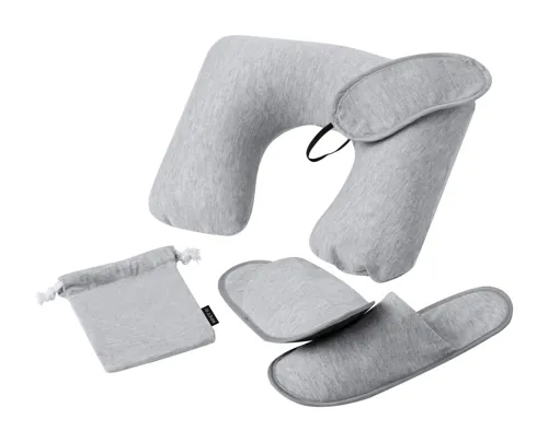 Poliészter utazókészlet RPET poliészter húzózsinóros tokban. Tartalmaz egy felfújható utazópárnát, szemmaszkot és papucsokat egy méretben (36-43).