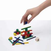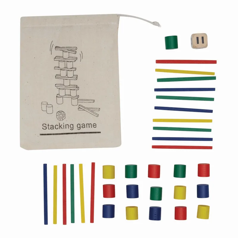 STACKING kirakós ügyességi játék: 16 db különböző színű kis fa pálca és 16 db fa henger, 11 db fa dobókocka, játékleírással (idegen nyelvű), környezetbarát vászon tasakban