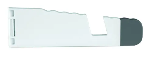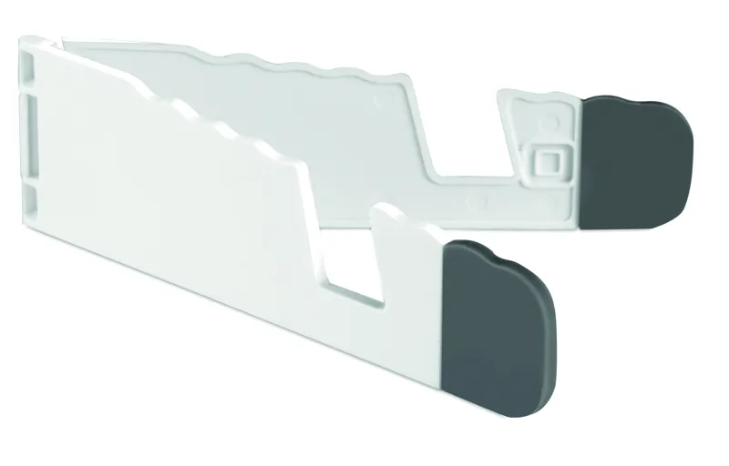 Összehajtható táblagép- és okostelefon tartó. Fehér ABS anyagból, szilikon véggel.