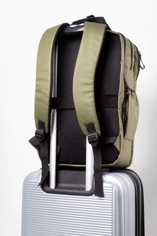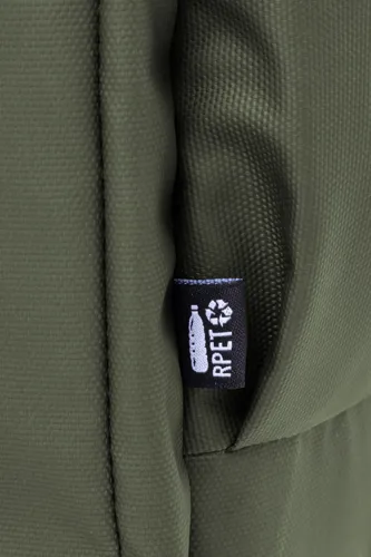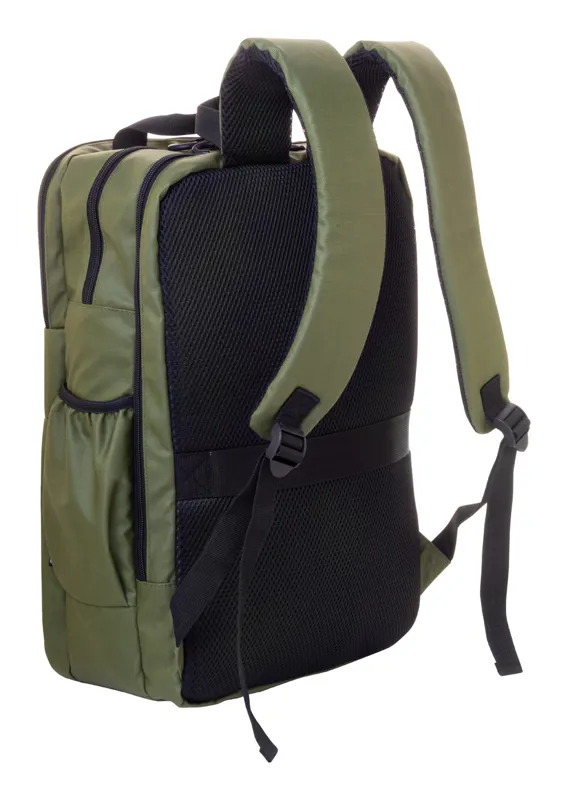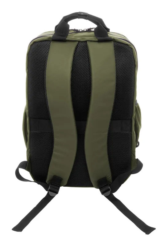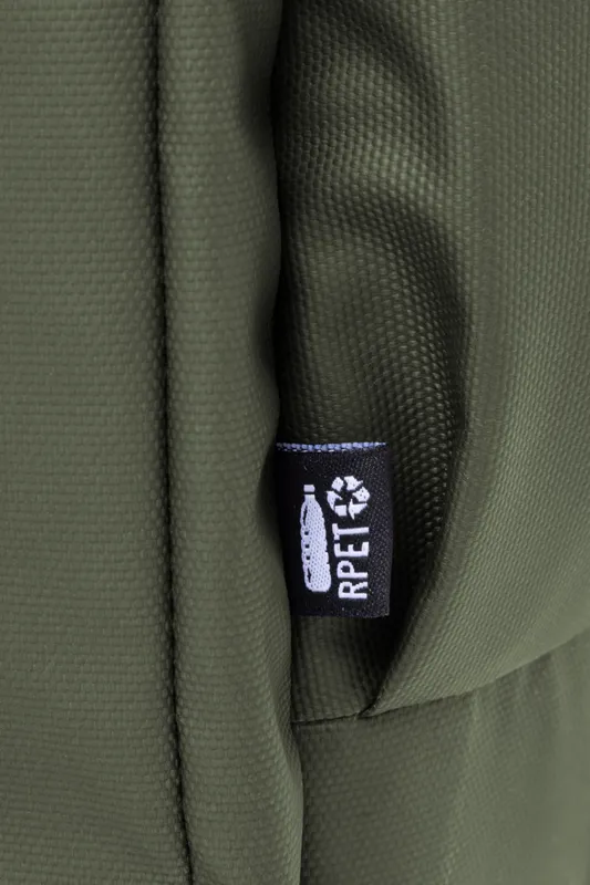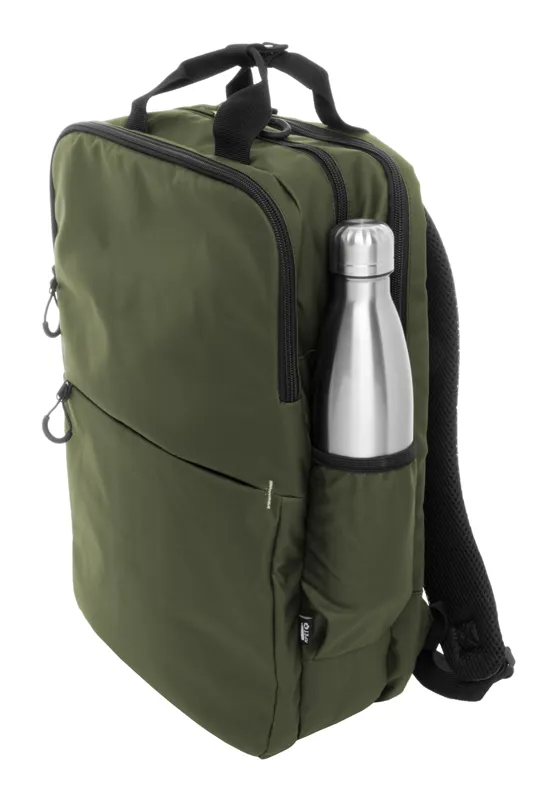 Vízálló RPET hátizsák 2 cipzáras rekesszel, 2 cipzáras elülső zsebbel, oldalzsebekkel és párnázott laptop (16") rekesszel. Bőröndpánttal, párnázott hát- és vállpánttal. Műbőr bevonatú 600D RPET poliészter, megkülönböztető RPET címkével.