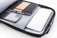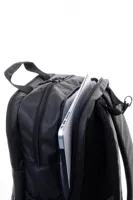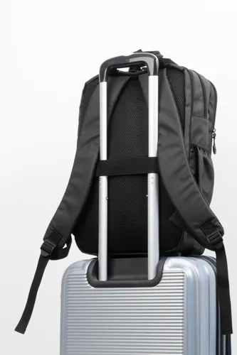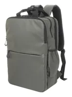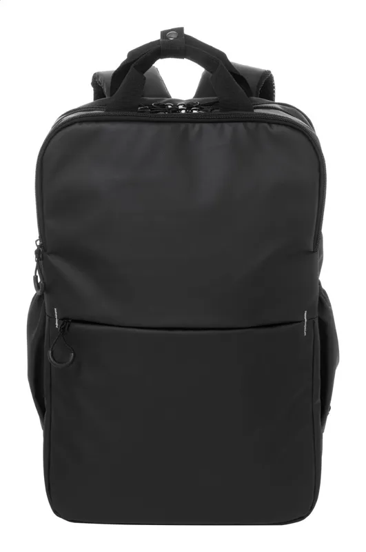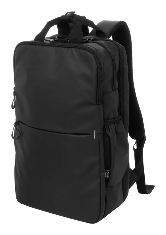 Vízálló RPET hátizsák 2 cipzáras rekesszel, 2 cipzáras elülső zsebbel, oldalzsebekkel és párnázott laptop (16") rekesszel. Bőröndpánttal, párnázott hát- és vállpánttal. Műbőr bevonatú 600D RPET poliészter, megkülönböztető RPET címkével.