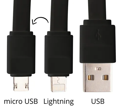 USB töltőkábel micro USB-vel és Lightning csatlakozóval, műanyag tokban. Hossza: 25 cm.