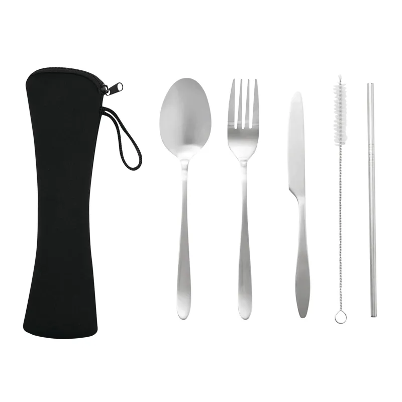 STELLOKIT rozsdamentes acél evőeszközkészlet, 5 részes: rozsdamentes acél kést, villát, kanalat, szívószálat és kefét tartalmaz a szívószál egyszerű tisztításához, cipzáras, füles kis neoprén táskában