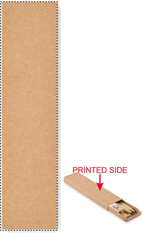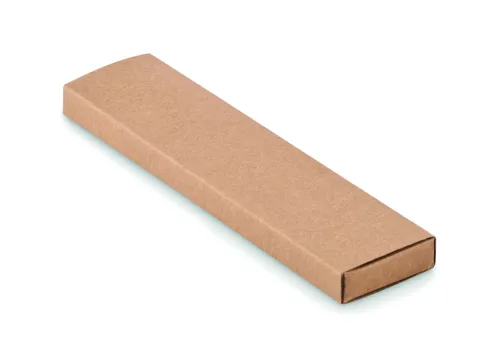 Újrahasznosított papírdoboz 3 kihegyezett ceruzával, 1 fa ceruzahegyezővel, 1 radírral és 1 fa vonalzóval.