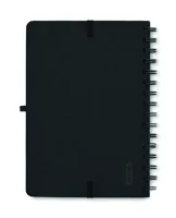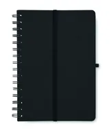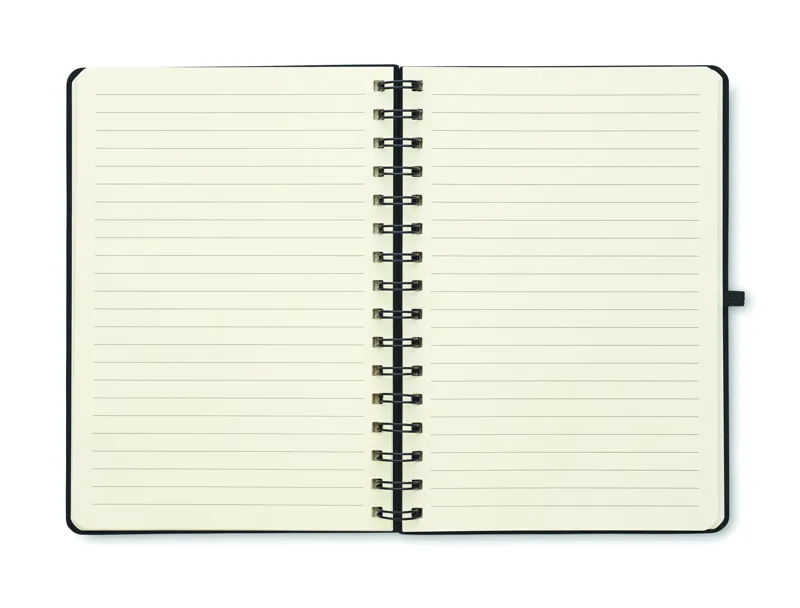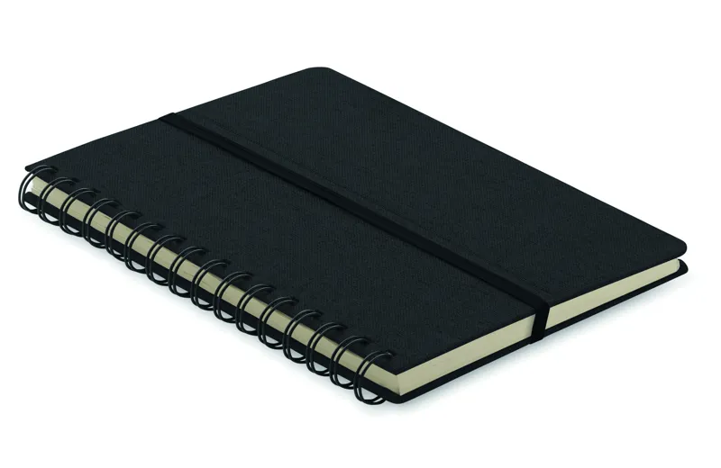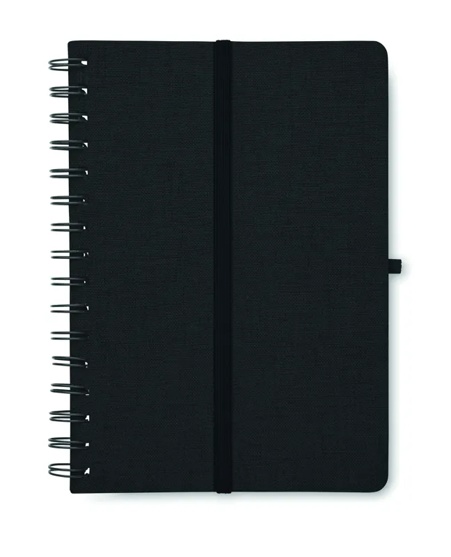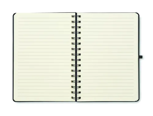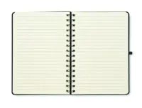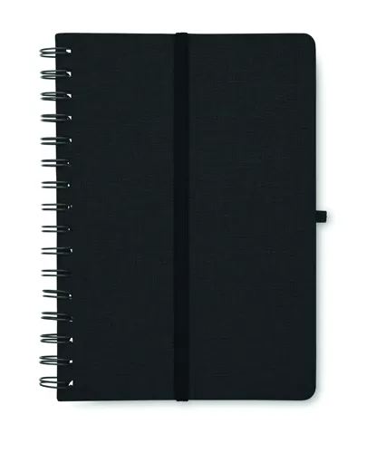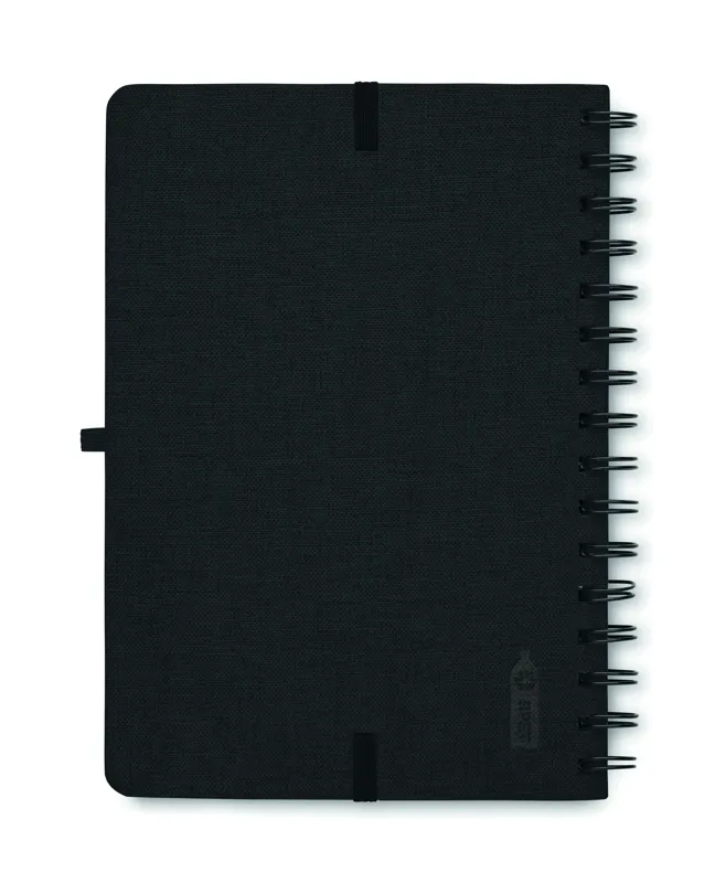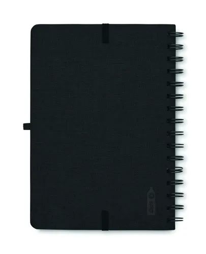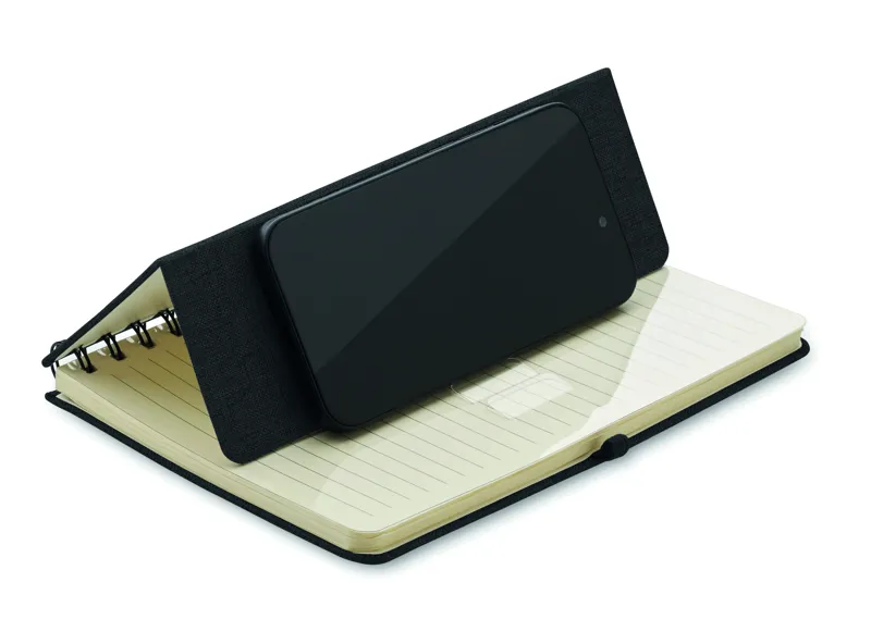 A5 jegyzetfüzet 600D RPET keménytáblás borítóval, okostelefon állvány funkcióval. Spirálozott. 160 vonalas oldal (80 lap). 70 g/m² újrahasznosított papír. Elasztikus zárópánt.