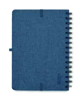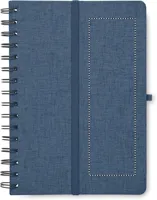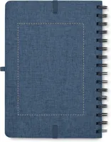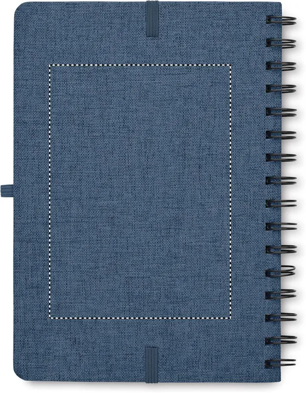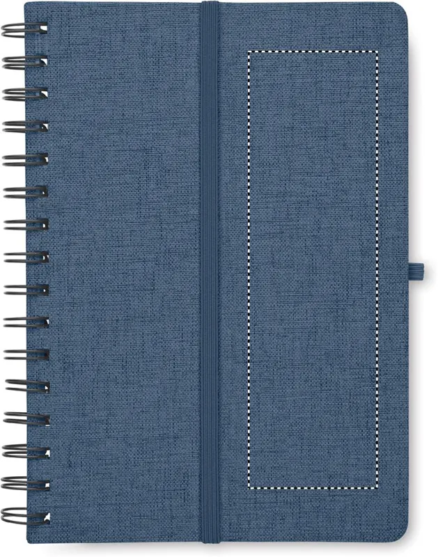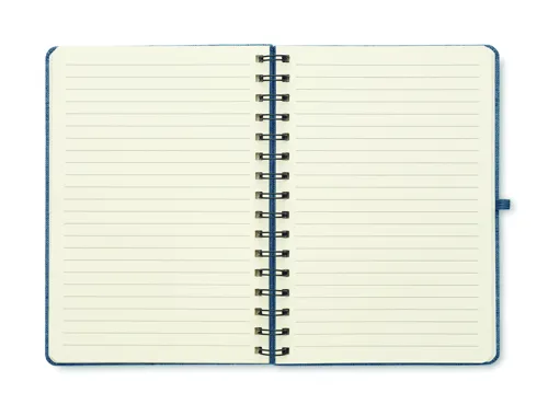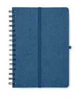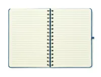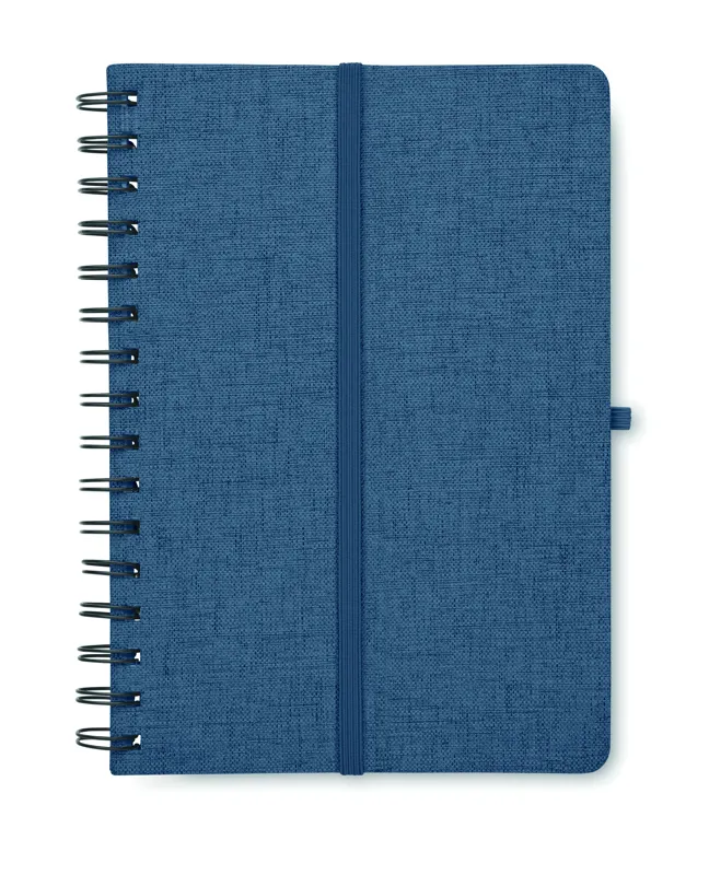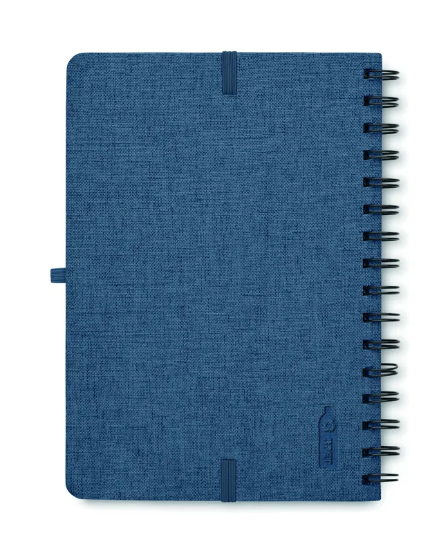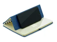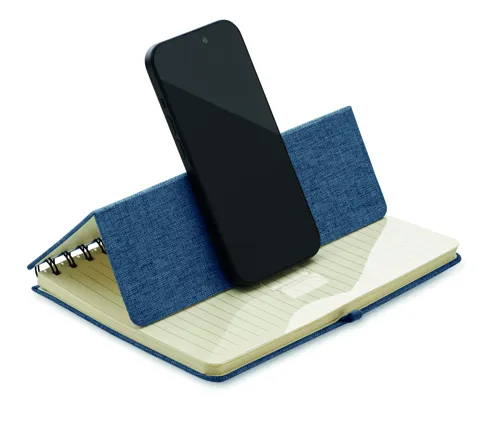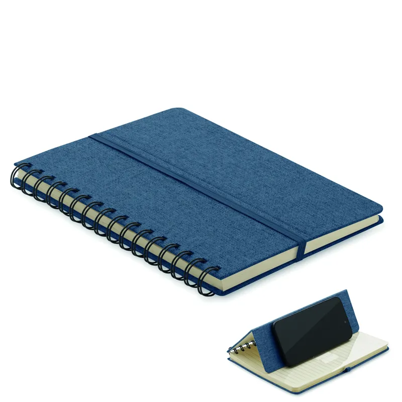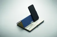A5 jegyzetfüzet 600D RPET keménytáblás borítóval, okostelefon állvány funkcióval. Spirálozott. 160 vonalas oldal (80 lap). 70 g/m² újrahasznosított papír. Elasztikus zárópánt.