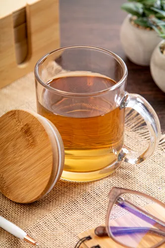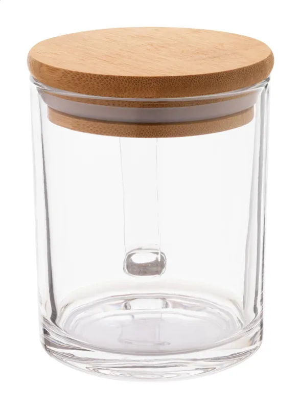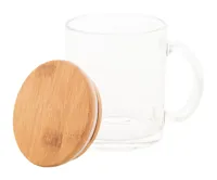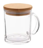 Újrahasznosított üveg bögre bambusz fedővel, 300 ml. Kraft papír dobozban.