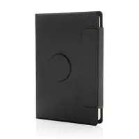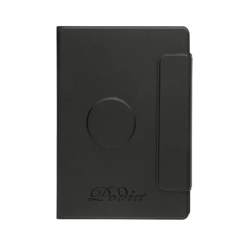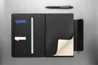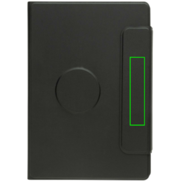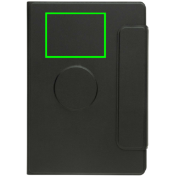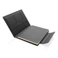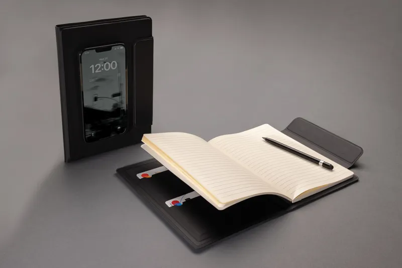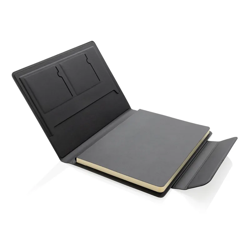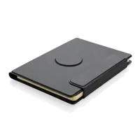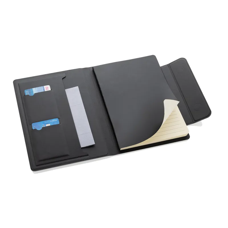 A5-ös mappa újrahasznosított poliészter PU mágneses zárral és mágneses telefontartóval, amely kompatibilis a magsafe iPhone 12 vagy újabb telefonokkal. Belül A5-ös vonalas jegyzetfüzet, a belső oldalak FSC® tanúsítottak és 64 lap/128 oldal; krémszínű vonalas papír; papír súlya 80 gsm, irattartó zseb és 2 névjegytartó. A jegyzetfüzet utántölthető.