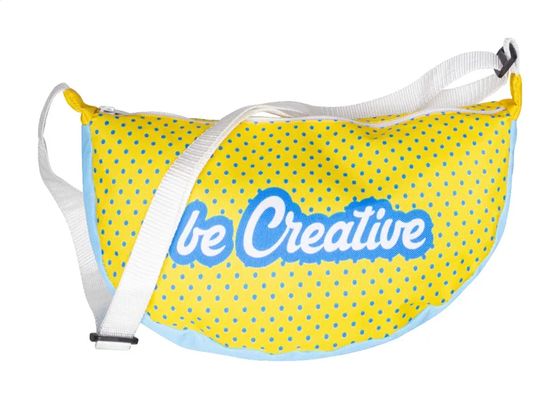 Egyedi gyártású oldaltáska 600D RPET poliészterből, állítható pánttal és cipzáras rekesszel. Teljes felületén szublimációs nyomtatott grafikával és megkülönböztető RPET címkével. Minimális rendelési mennyiség: 25 db.