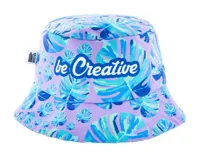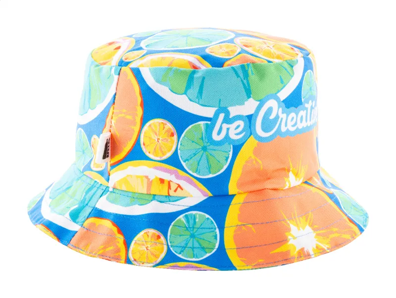 Egyedi gyártású RPET halászsapka, teljes felületén szublimációs nyomtatott grafikával. 600D RPET poliészterből (220 g/m²) készült, megkülönböztető RPET címkével. Minimális rendelési mennyiség: 25 db / méret. 3 méretben kapható: S (ø55cm gyereknek), M (ø58cm) és L (ø60cm).