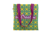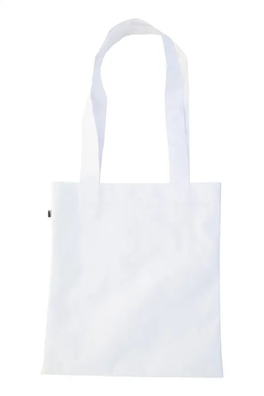 Egyedi gyártású 600D RPET poliészter bevásárlótáska hosszú hordfüllel. Teljes felületén szublimációs eljárással emblémázva és megkülönböztető RPET címkével. Minimális rendelési mennyiség: 25 db.