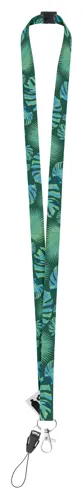 Egyedi, 15 mm széles RPET műanyag nyakpánt fém karabinerrel, mobiltelefon-tartóval és biztonsági csattal. Szublimációs eljárással nyomtatott grafikával mindkét oldalon. Min. rendelés: 100 db.
