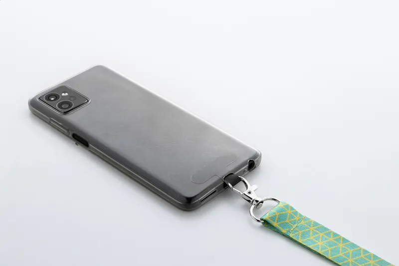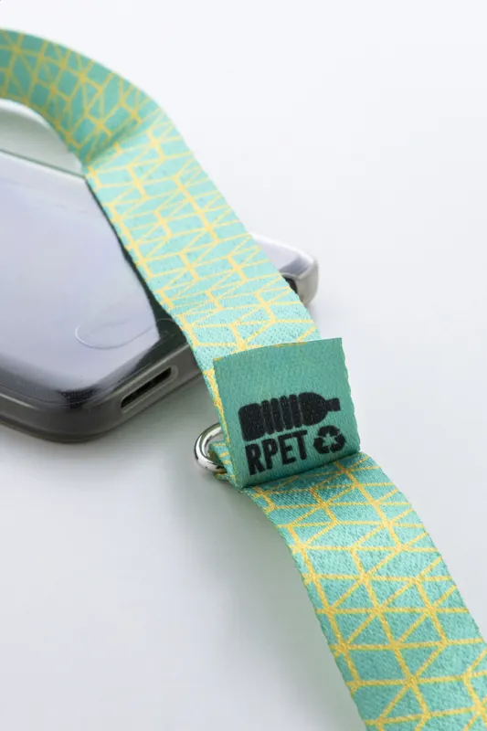 Egyedi gyártású, RPET mobiltartós nyakpánt fém karabinerrel és telefonbetéttel, szakadásálló papírból. Mindkét oldalon szublimációs nyomtatott grafikával. Minimális rendelési mennyiség: 100 db.